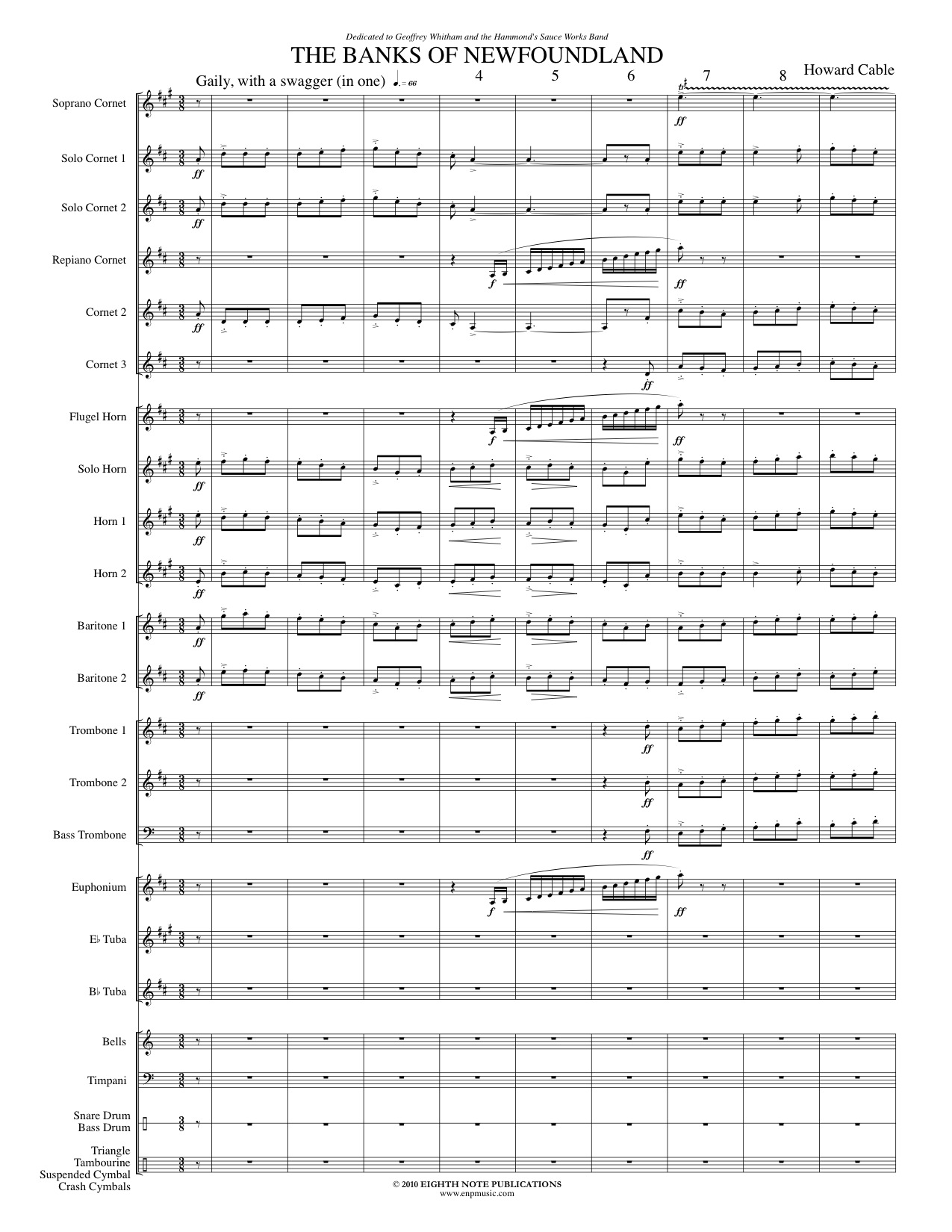 Howard Cable has created The Banks of Newfoundland which is a collection of well loved folk songs from eastern Canada. This brilliant montage will challenge every section of the band. Soaring solos, technical lines and colorful percussion writing make this a classic for band. |
