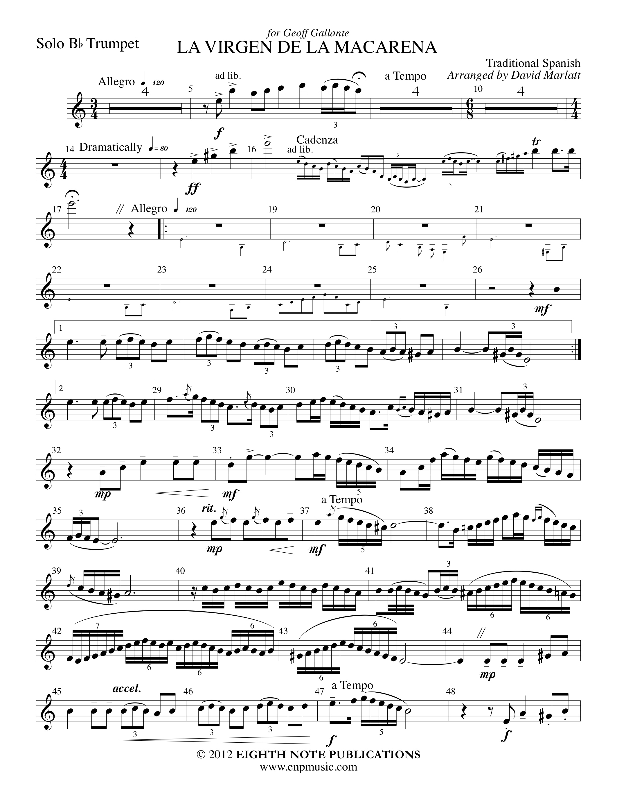La Virgen de la Macarena is a traditional bullfighting song made famous by the great trumpet virtuoso Rafael Mendez. Many great players have performed this standard trumpet solo including Doc Severinson and The Canadian Brass. However the arranger s favourite version is a recording by Mr. Vincent Di Martino with the Band of the Battle Creek. There has been a short introduction added quoting part of Bizet s Carmen. This introduction serves to set up both the soloist and the famous bull tune. Ol |