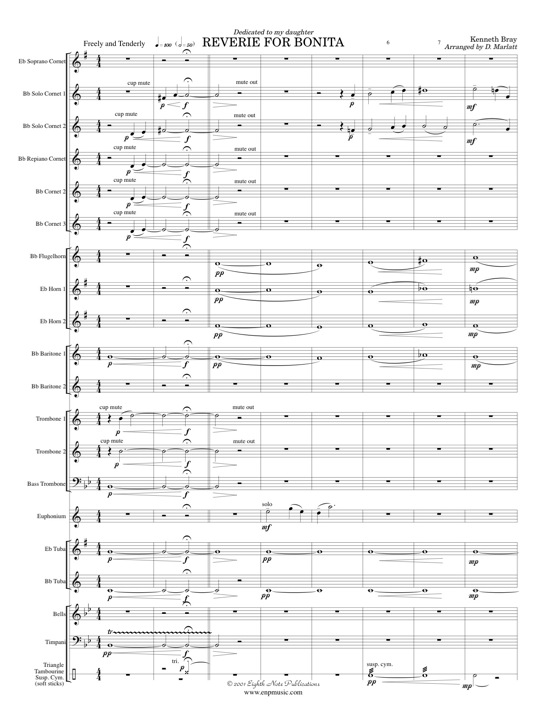 A lush and beautiful work composed by Kenneth Bray for his daughter, Reverie for Bonita features the horn section, colourful use of mutes and simple, elegant themes. Showing off the lyrical side of the band, this work is an ideal mood change in a concert. |