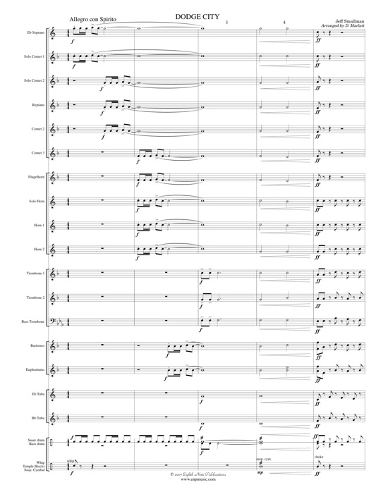 Dodge City is an exuberant piece designed to take you back to the time of the old west. As the title implies, this is a work that will bring to mind stagecoaches and sagebrush, cowboys and cactus, sheriffs, showdowns and whatever else reminds you of those frontier days. Quick and lighthearted, the opening and closing sections frame a lyric middle section. Dodge City has captured the atmosphere of a bustling city from the old west and is sure to captivate performers and audiences alike.