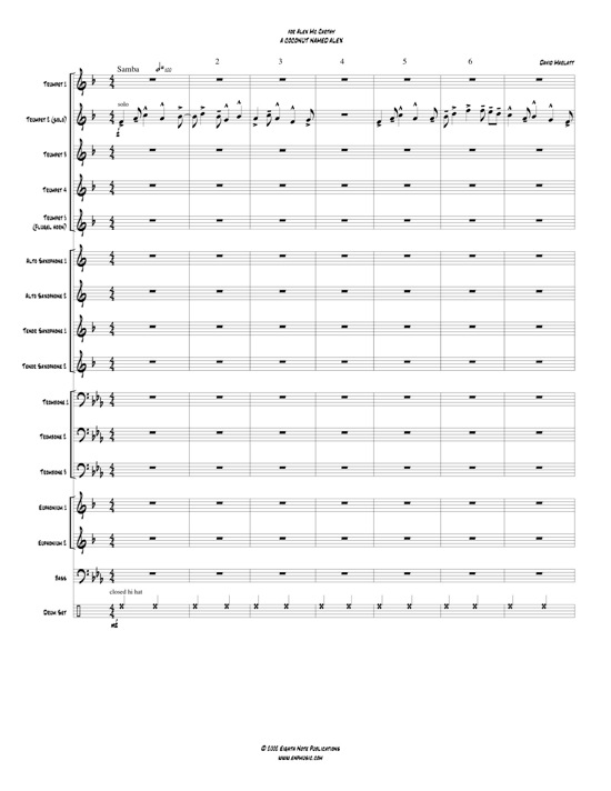 This colourful title aptly combines the basis for the piece and the person it was written for. Tenth grade trumpet player Alex McCarthy would come to brass quintet rehearsals and, rather than warming up on long tones or lyrical studies, he would play excerpts from the Denis Di Blasio tune Coconut Champagne which was written for Maynard Ferguson and his band. This piece uses that melodic material as a base for this upbeat samba tune. There is a solo section for cornet and a written out solo has been provided.