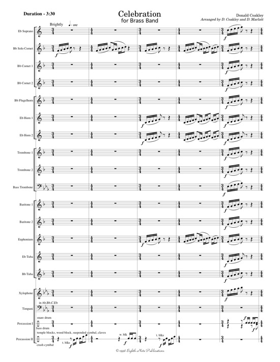 A dynamic work by a dynamic Canadian composer. Full of rhythmic and melodic interest, this brass band original is a fantastic addition to the repertoire. The tuneful melody is passed throughout the ensemble and even the tubas have a section of melody. Percussion parts animate the driving rhythms and elegant writing in the winds. Another great work by this talented composer, Celebration is a sure success to open or close a concert. |