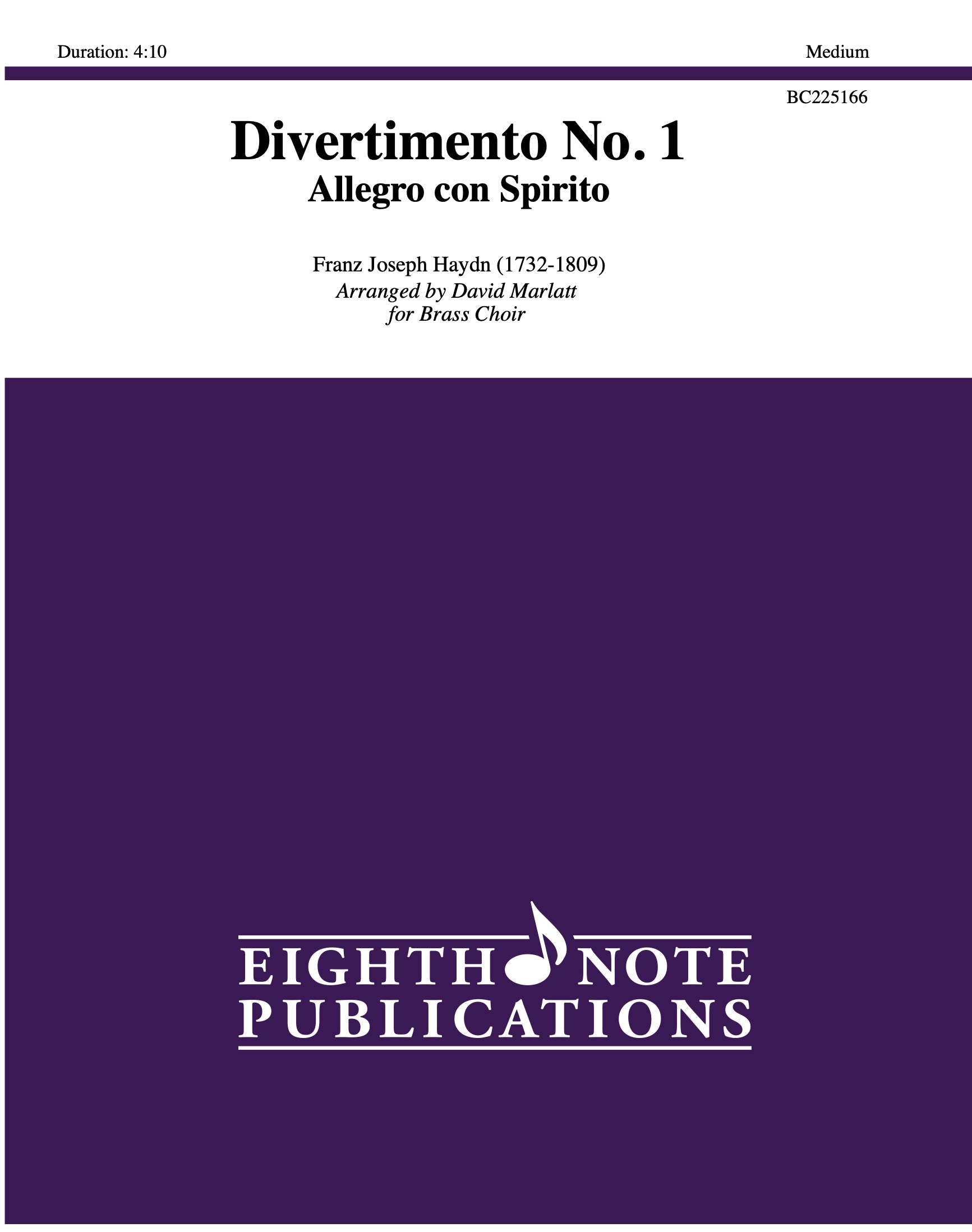 The Allegro con Spirito movement of the Divertimento No. 1 is from the Six Feldpartiten (open air suites), composed by Haydn in the early 1780s. Originally scored for two oboes, two French horns, three bassoons and a B-flat serpent, this piece works beautifully for brass ensemble and percussion. |