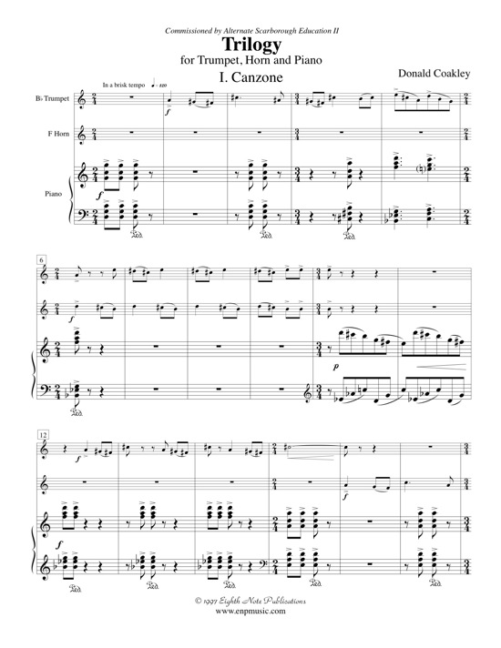 A great new chamber piece by a great Canadian composer. Once again Donald Coakley demonstrates his flair for writing for brass instruments. Written for this unique combination of trumpet, horn and piano, this work contains sections of soloistic and supportive material for each member of the ensemble. An exciting addition to the brass repertoire courtesy of a commission by ASE II (Alternative Scarborough Education) for students in the instrumental music program in Scarborough, Ontario. This piece is very accessible for good high school level musicians. |