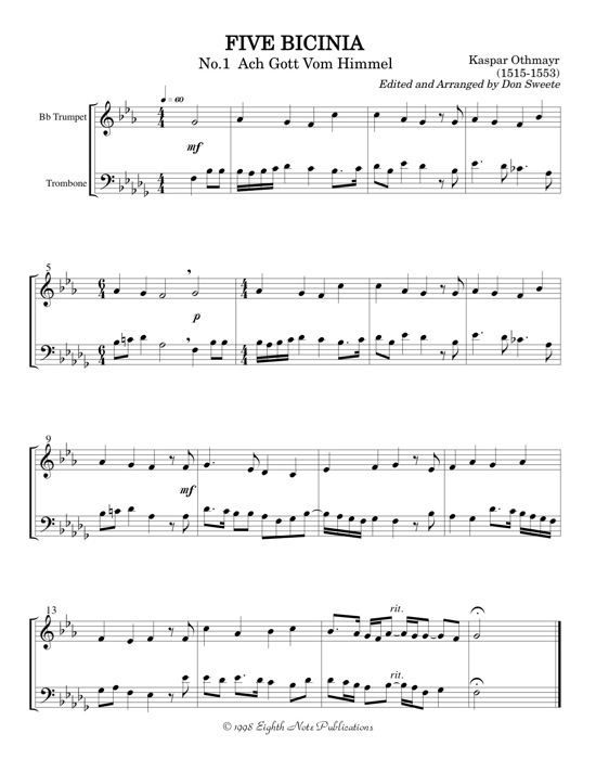 This work is scored for trumpet in b-flat and trombone or trumpet in b-flat and horn. These duets are short but interesting and the flexibility of being able to play with horn or trombone adds to the usefulness of the work. They are not too difficult and would make an interesting change of pace on a brass quintet concert, featuring two of the members in the ensemble. |