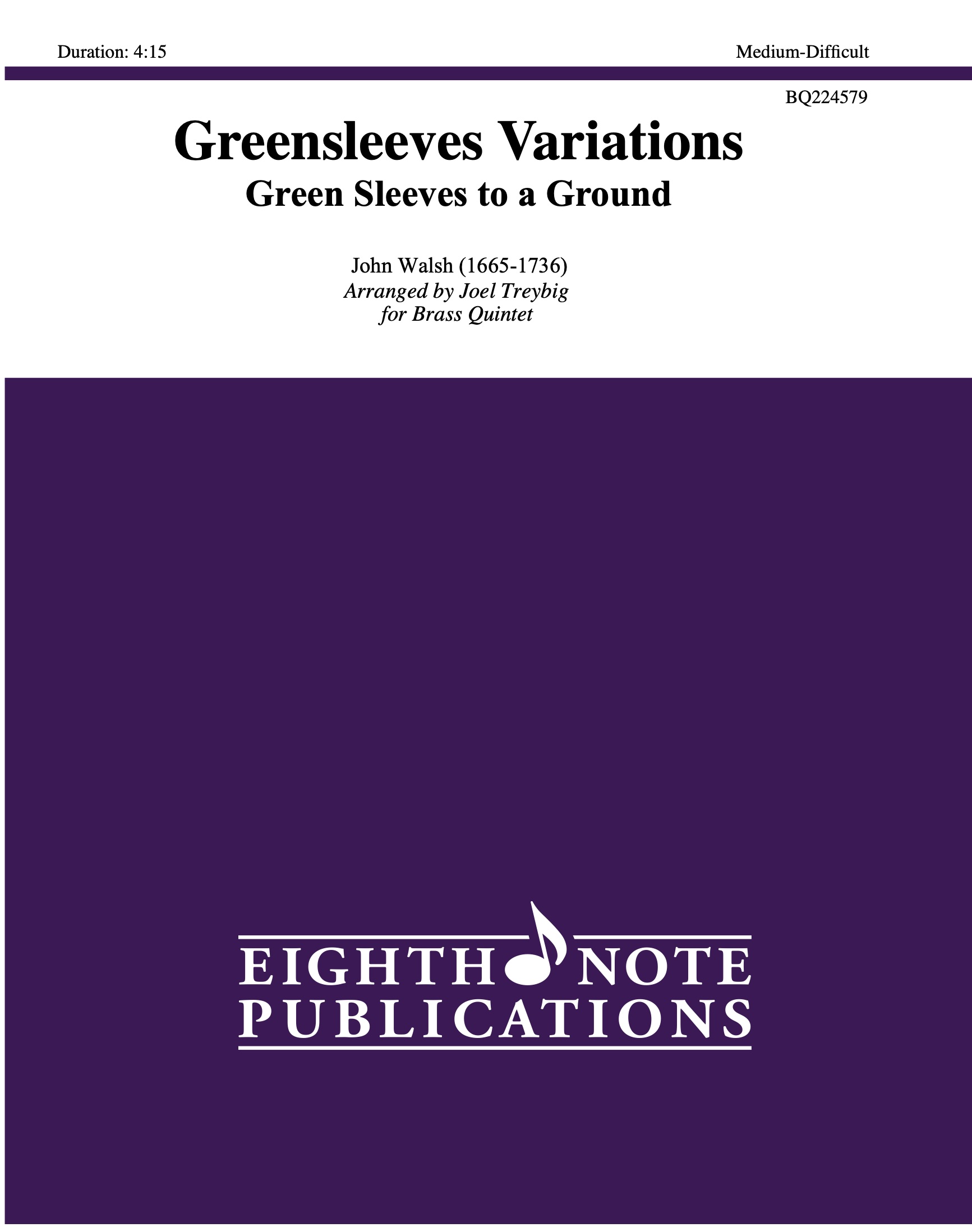 Green Sleeves to a Ground, published in 1706, was a collection of variations over ostinato bass lines. The recorder had become a popular instrument at the time the book was published, and this collection of variations over known melodies was attractive to performers interested in showcasing their virtuosity. The present arrangement for brass quintet varies the instrumentation throughout, voiced so that each of the instruments not only has melodic material to play, but also has moments to rest while others carry the melody. |