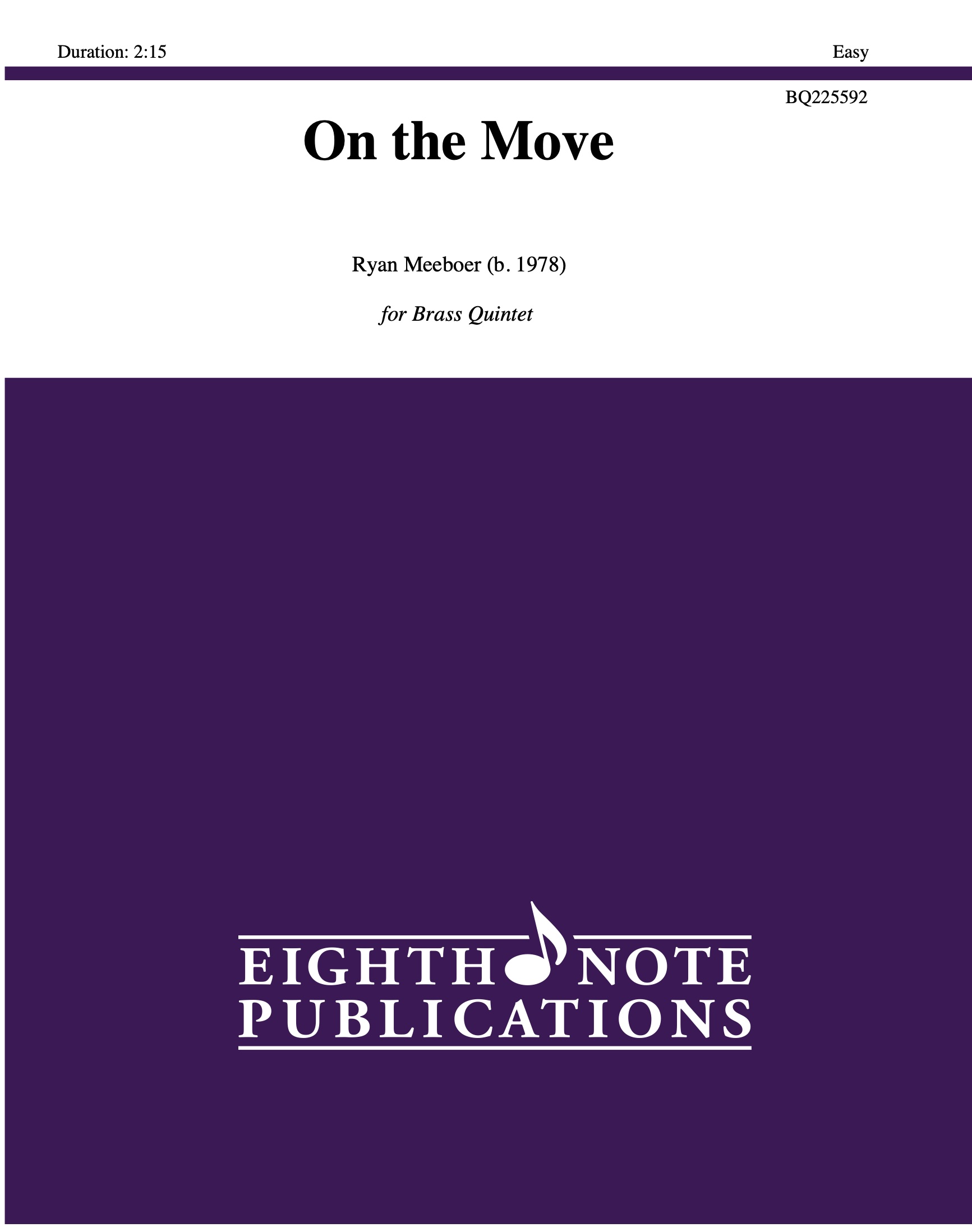 On the Move is the perfect song to transition students from the method book to playing ensemble music. Composed mainly using the first seven pitches learned in most method books and nothing faster than a quarter note, this piece uses unison rhythms with block harmonies to give performers more experience reading music that is not monophonic. |