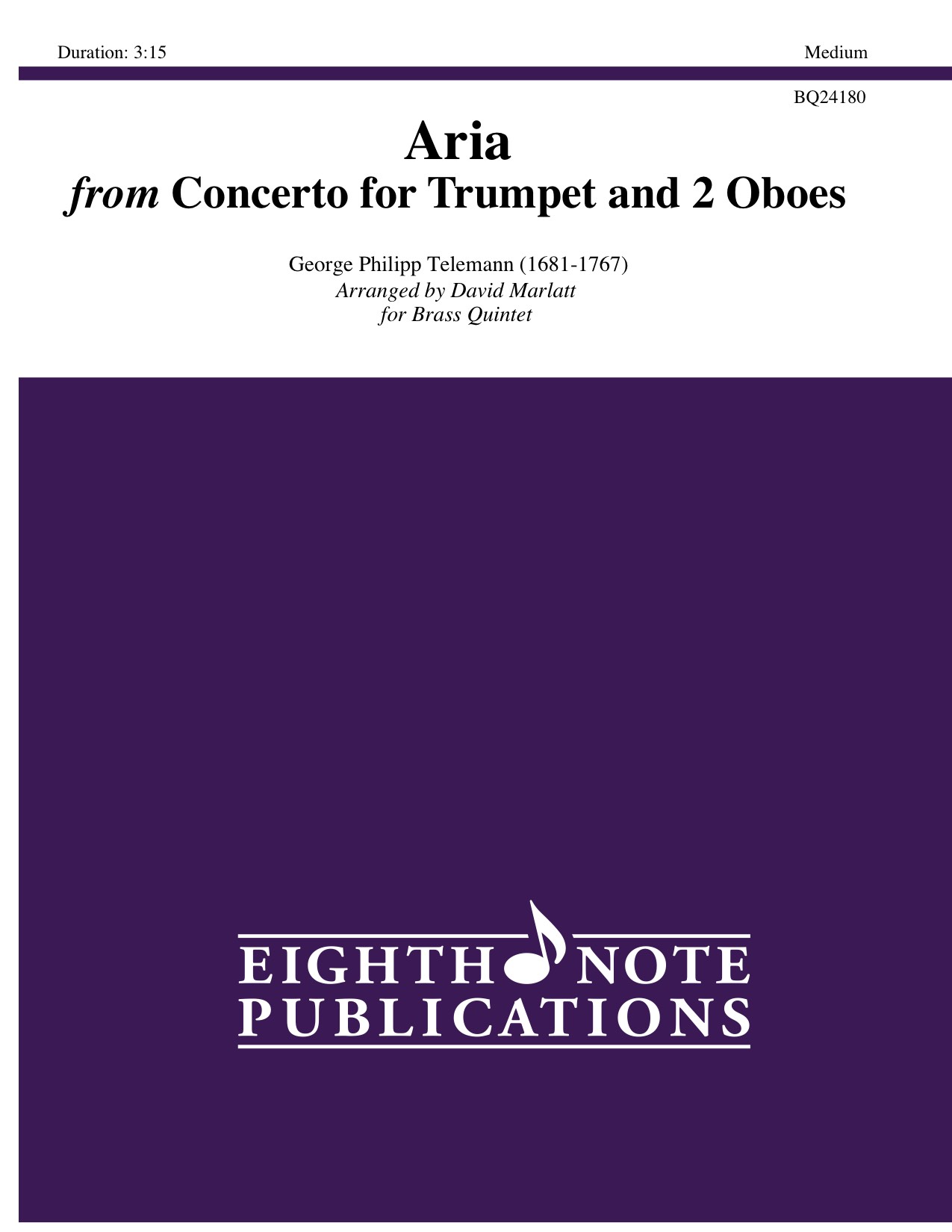 This is the beautiful slow movement from the famous Trumpet Concerto by Telemann. In this movement the oboes, replaced here by trumpets, play an elegant duet over a simple wandering continuo line. This is a da capo aria in which the D.C. has been written out with some ornaments. This is a great piece that would work well at a church or wedding service as well as on a concert. |