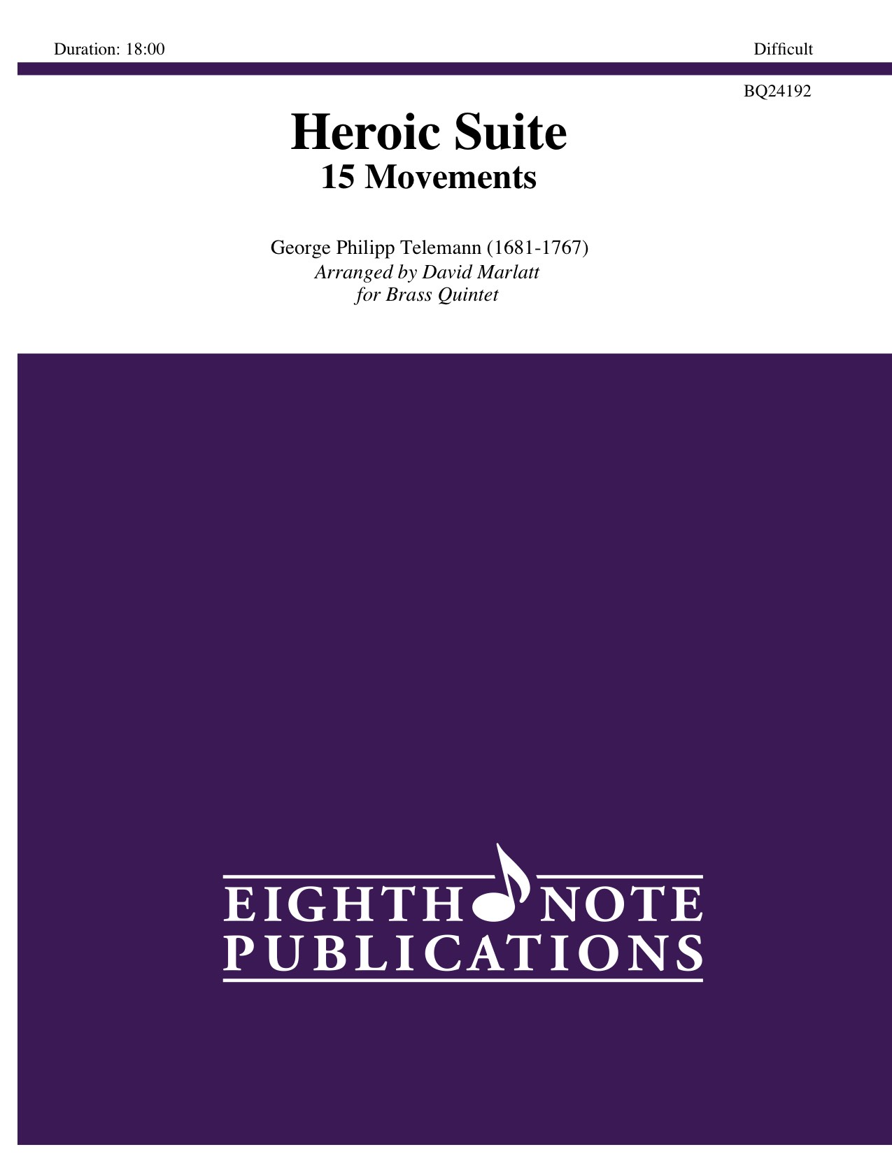 The Heroic Suite is a rearranged compilation of pieces taken from various Telemann compositions for solo instrument and continuo (organ). In this arrangement, containing fifteen pieces, the solo voice is found in all the upper four voices and the continuo line is performed by the tuba. The pieces used in this arrangement are: Solemnity, Mercy, Valour, Sweetness, Tranquillity, Aria, Kindness, Minuet, Generosity, Loure, Majesty, Call to Arms, Love, Rejoicing, Jollity and Hope.
