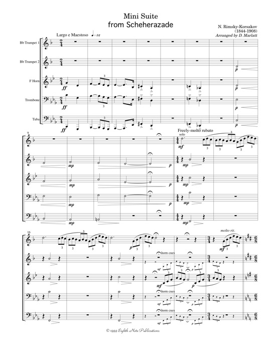 The famous themes from this orchestral masterpiece have been collected and arranged for brass quintet. Included in this mini suite are the principal melodies from The Sea and Sinbad's Ship and The Young Prince and Princess. This is not too difficult and is approachable by students in mid-high school. |