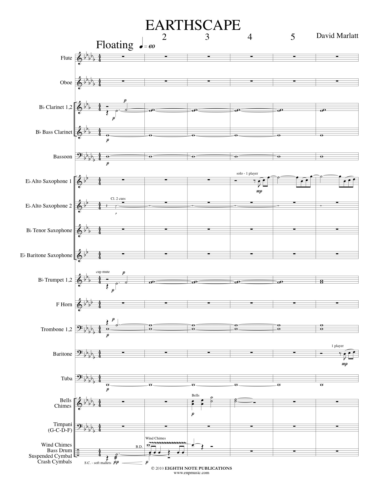 Earthscape is a lyrical piece inspired by the view of our planet from space. In the silent, black vacuum of space exists this bright blue planet, slowly rotating, giving astronauts a serene and breathtaking view of the only source of life in our solar system. This work features the band in a peaceful mood and offers the opportunity for some soloistic playing by a flute, clarinet, alto saxophone, trumpet and baritone. |