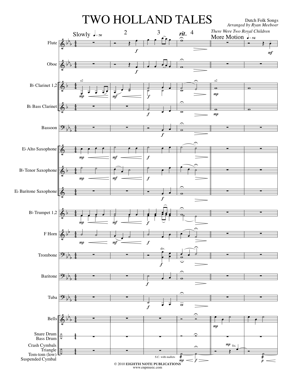 Inspired by two folk songs from the arranger s Dutch heritage, Two Holland Tales is a piece that combines both lyrical and upbeat sections. Daar waren twee koningskinderen (There Were Two Royal Children) is the opening lyrical movement which displays the talents of both the wind and brass sections. The piece then moves into Toen ik op Nederlands bergen stond (I Once Stood On the Netherland s Hills). This is a fast movement in 6/8 and features the percussion section. Great arrangement for young band. |