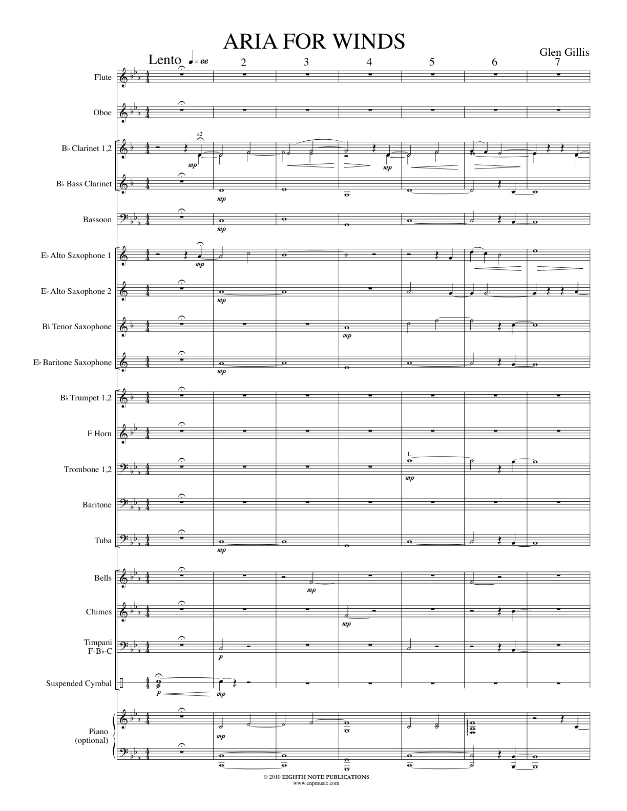 Aria for Winds is based on Glen Gillis earlier composition, Nicole s Aria for alto saxophone and piano - dedicated to his daughter shortly after she was born. In the Aeolian mode, Aria for Winds incorporates some subtle dissonances within a hollow open fifth harmony. Haunting melodic lines combined with colorful percussion writing make this a terrific concert or contest piece. |