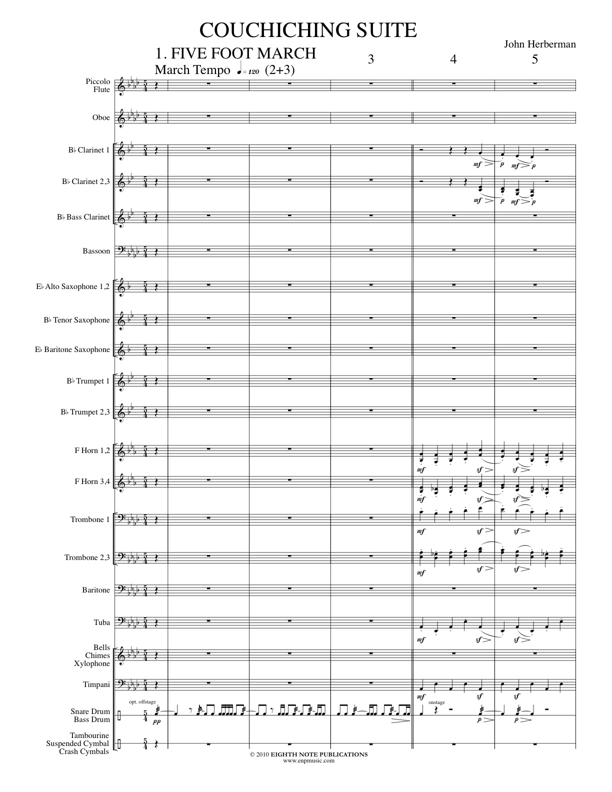 Couchiching Suite was written as a commission from the National Music Camp of Canada which runs each year on the shores of beautiful Lake Couchiching north of Toronto, Canada. The first movement is a march in 5/4 that derives its pulse from the melodic shapes rather than set groupings of beats. The middle movement is a slow homophonic song with rich harmonies and thick chordal textures requiring good listening and tuning skills. The third movement is a burner in mixed meters featuring solo alto saxophone and a soaring soli for the french horns. |