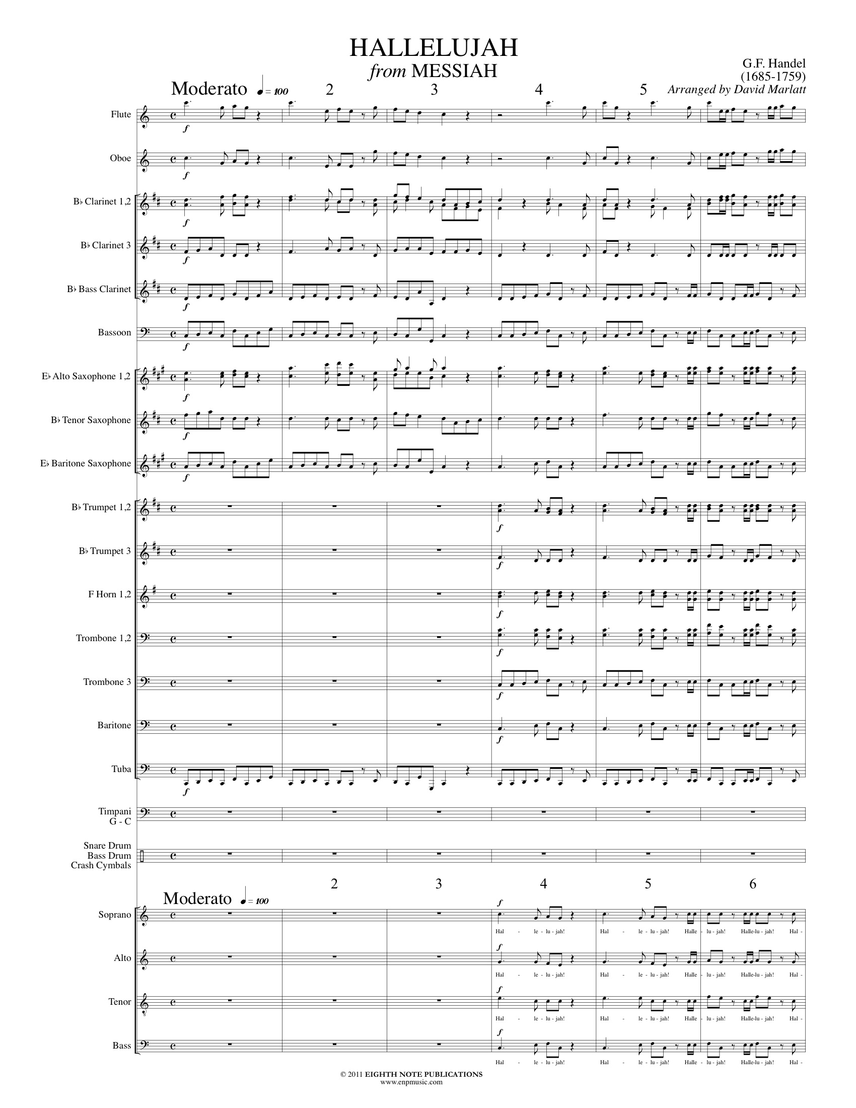 Handel s most frequently performed and most famous oratorio is probably best known for the famous Hallelujah. The Hallelujah is the grand chorus that caused the King to rise from his seat and as all good subjects, the entire audience rose with him. This tradition holds true even today reminding us of the great beginnings of this powerful music. This arrangement, for band and optional choir, has been lowered a tone from the original into C concert.