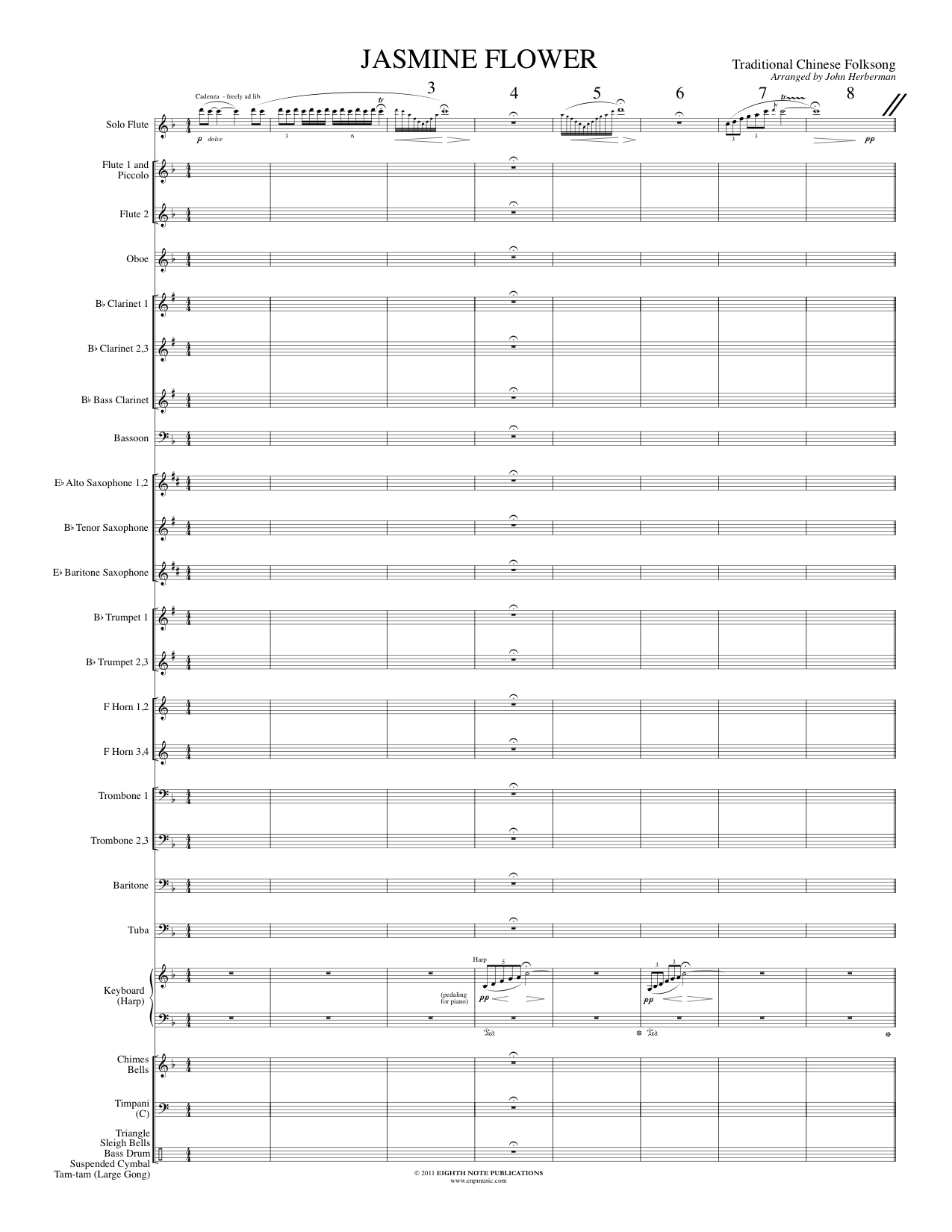 This beautiful and lyrical Chinese folksong features the talents of a flute player from within the ensemble. There is a harp part that could easily be performed on keyboard (set to harp sound) or on piano. The melody flows throughout the ensemble with many sections playing the melody line. Wonderful warm colors are brought forth with the arrangers clever use of orchestration. |
