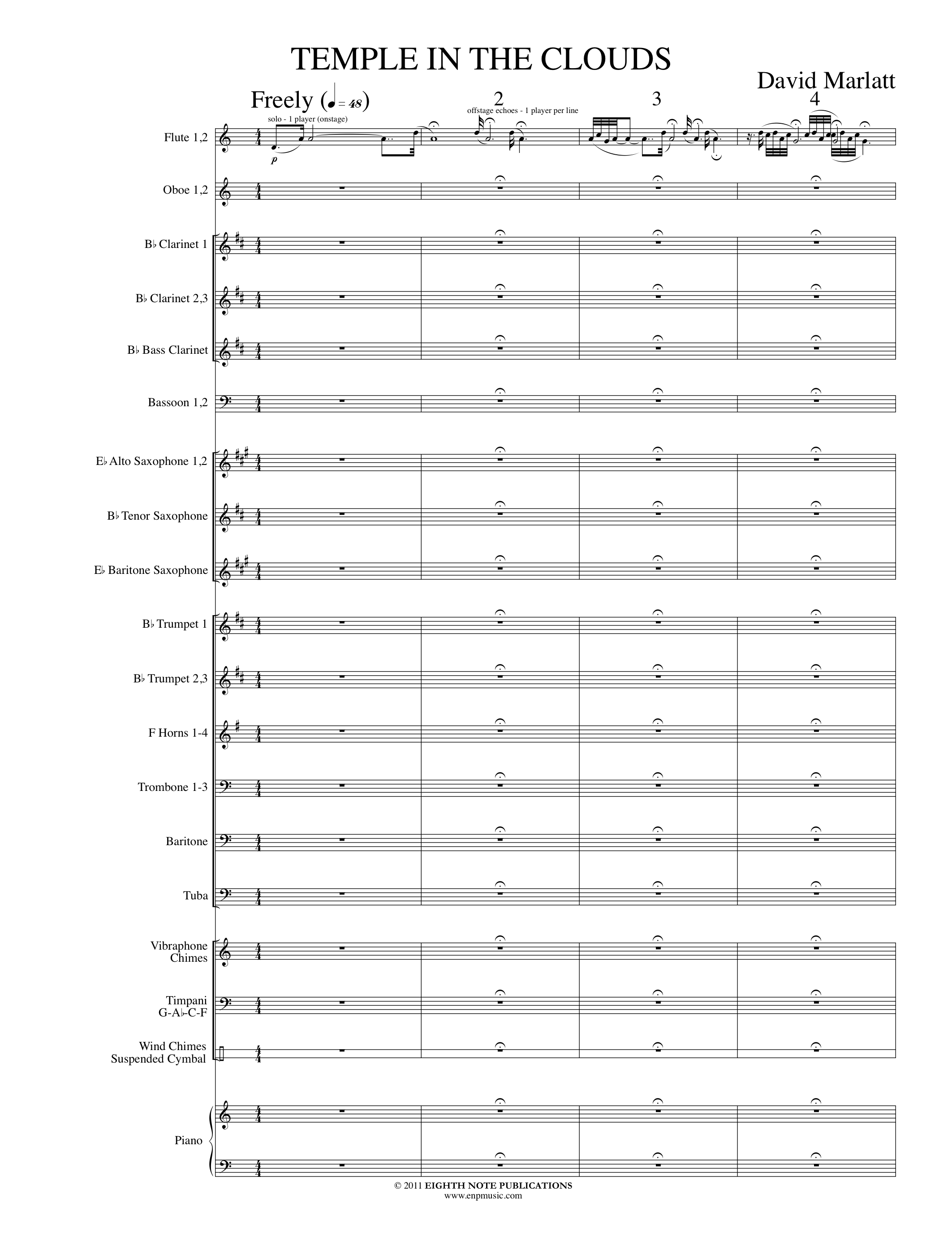 Temple in the Clouds is an ethereal and effective work for winds, piano and percussion. It opens with 3 solo flutes echoing a call as if it were played on a mountain top. Various soloists are featured throughout including flute, oboe, clarinet and alto saxophone. Full sonorous brass section moments contrast the clear, lightly scored woodwind texture. Powerful and transparent. |