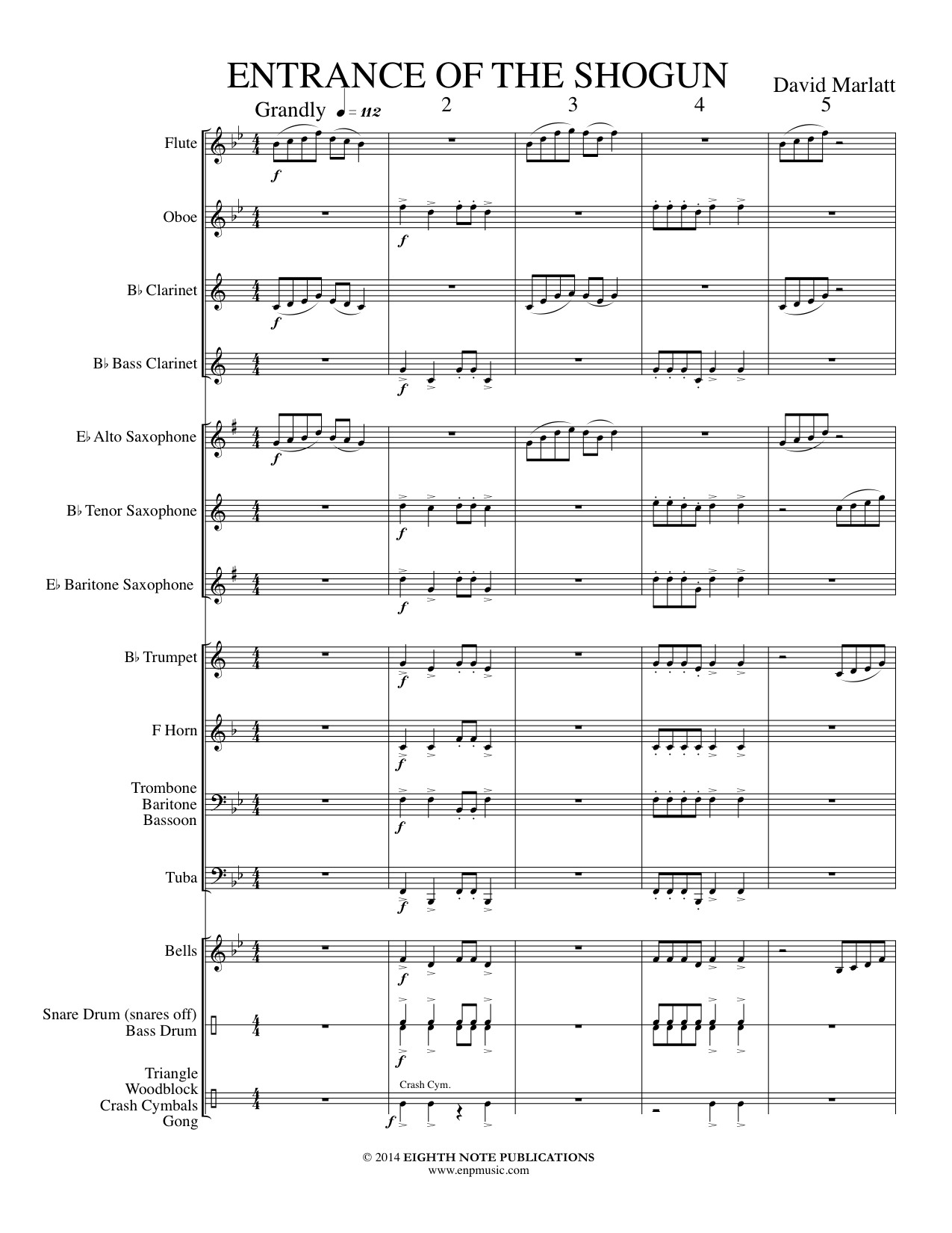 In ancient Japan, the shogun were the military commanders appointed by the emperor. Grand and regal, when a shogun appeared to the public, there was a sense of awe and power at this warrior leader. Flanked by armies of samurai warriors, their power was obvious and their respect was demanded. This clever piece for very young band uses only the 5 notes used in a pentatonic scale (like playing just the black keys on the piano). This gives this beginning band piece a true Asian sonority. |