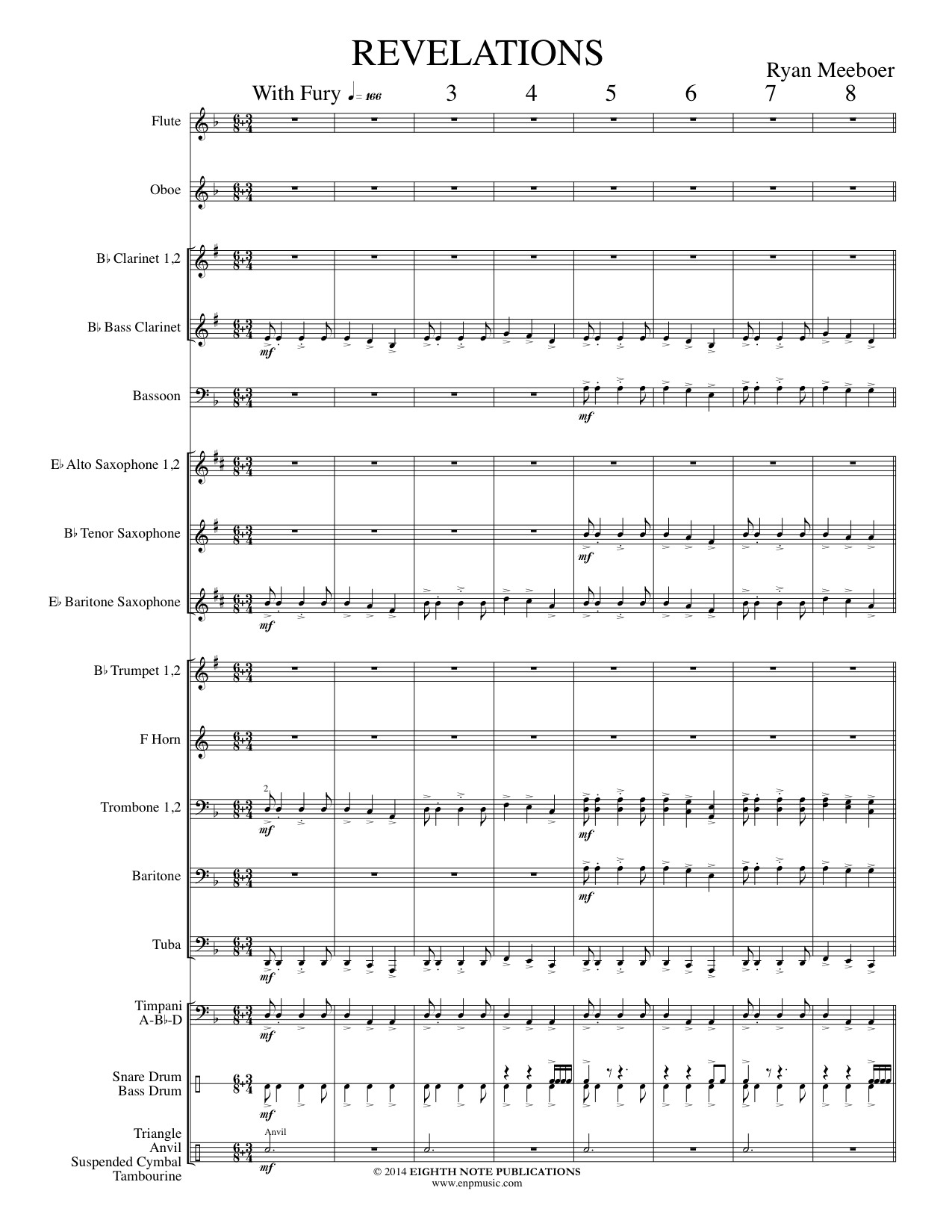 Revelations is a piece with a dark, heroic drive to it, almost as if it reflected a biblical revelation. It opens in a alternating 6/8, 3/4 groove with the lower voices and then builds. Firey rhythms and great contrasting melodies and countermelodies make this powerful piece a great choice for audiences and for the band playing it. |