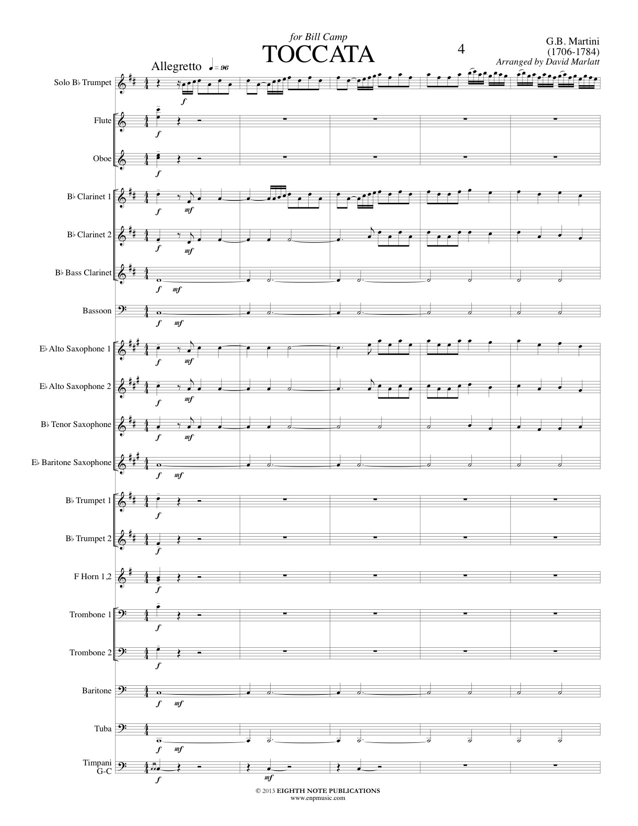 This piece, originally for organ (using the trumpet stop), lends itself well to a solo trumpet to perform the majority of the melody line with colorful, interesting parts in the remainder of the ensemble. The full title is Toccata per il Deo Gratias. |