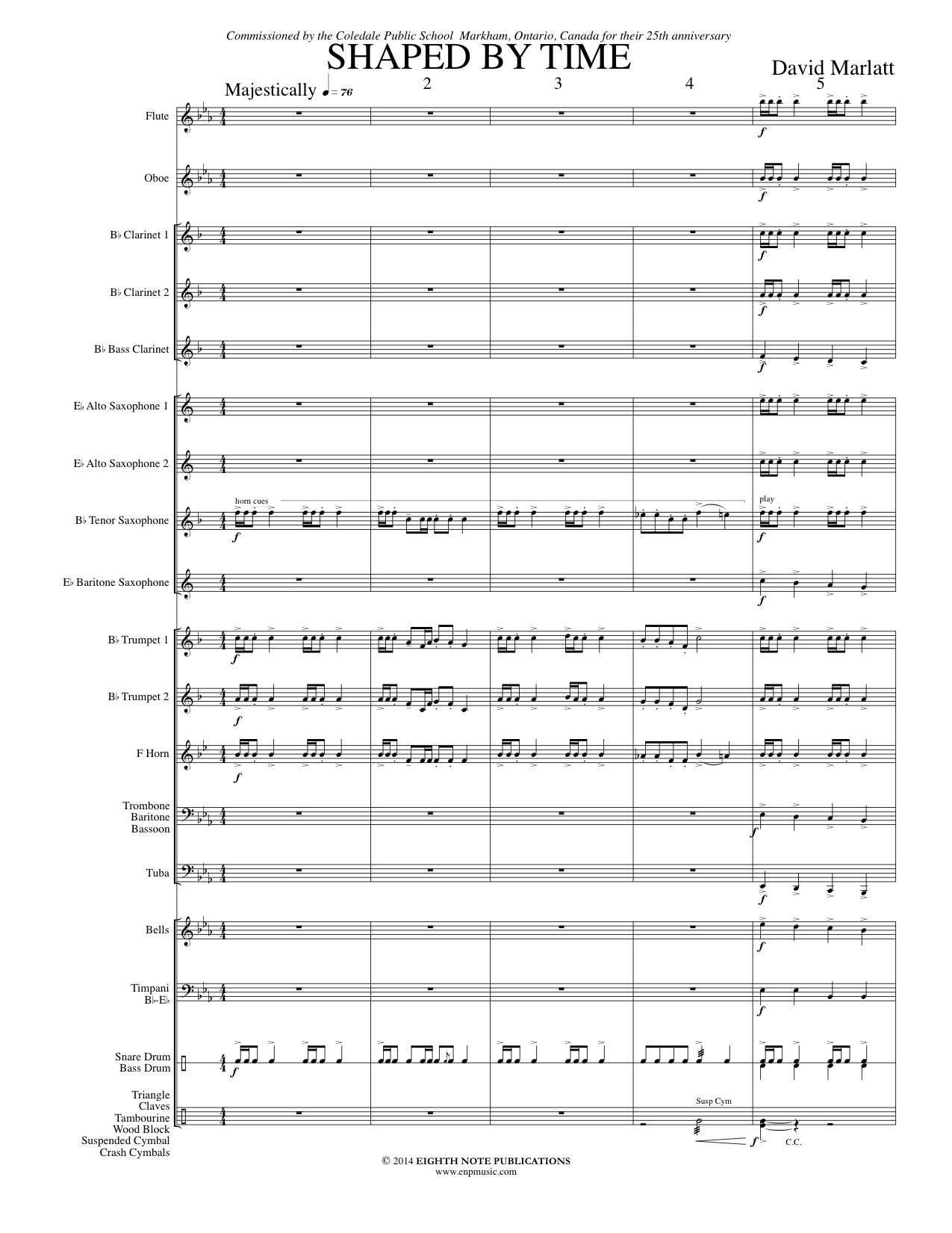 Shaped by Time is a short fanfare/overture to celebrate the 25th anniversary of Coledale Public School in Unionville, Canada. It opens with a brief fanfare section before breaking into a fun, shifting upbeat feel with melody and rhythmic interest found throughout the ensemble. Colorful percussion parts drive this work from top to bottom. |