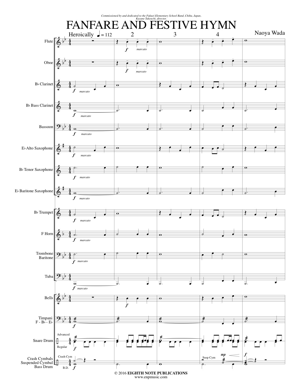 Fanfare and Festive Hymn uses only the first six notes of the Bb major scale making the piece accessible in the first year of study. The forceful fanfare leads to a lyrical theme, and ends with a fanfare theme again.