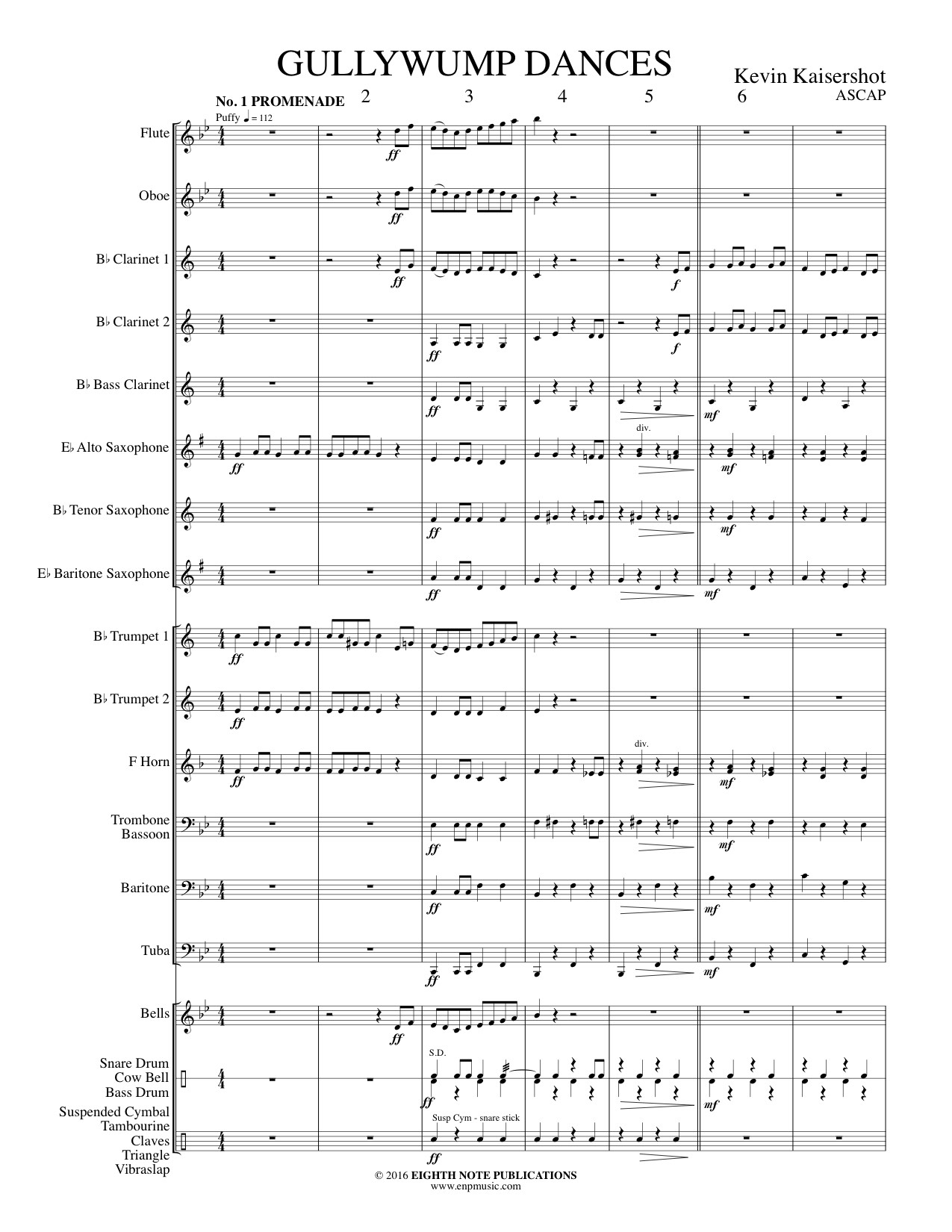 Gullywumps are mythical little creatures about 2 feet tall that like to dress in purple and orange. Not particularly coordinated, they still love to dance. Here in a suite of 3 dances (Promenade, Two Left Feet and Jig) the Gullywumps try their best to be rhythmic. Fun and clever melodic and rhythmic figures combined with colorful percussion make this a unique addition to music for developing bands. |