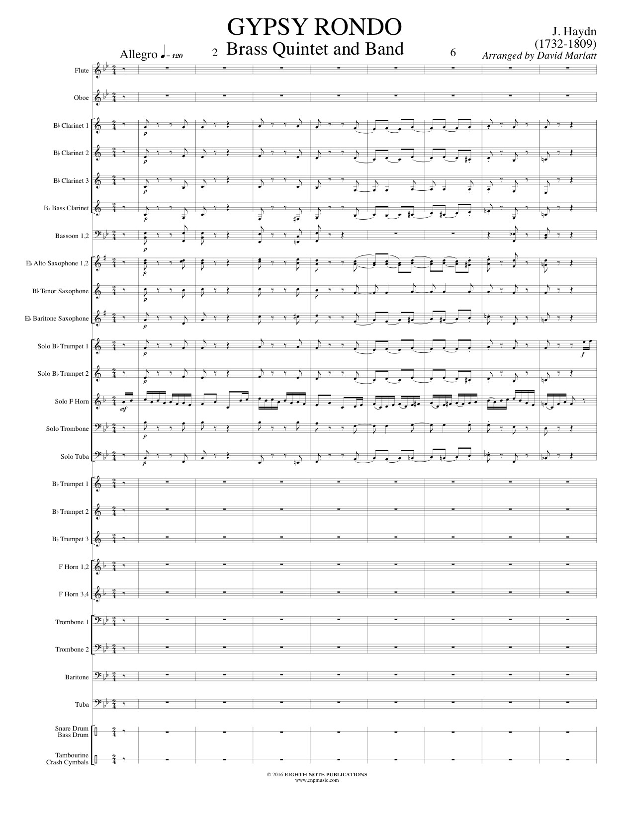 The fun technical lines, originally in the piano and violin, are split among the brass quintet. The band parts are very light and straightforward which allows for some rest on a long concert. |