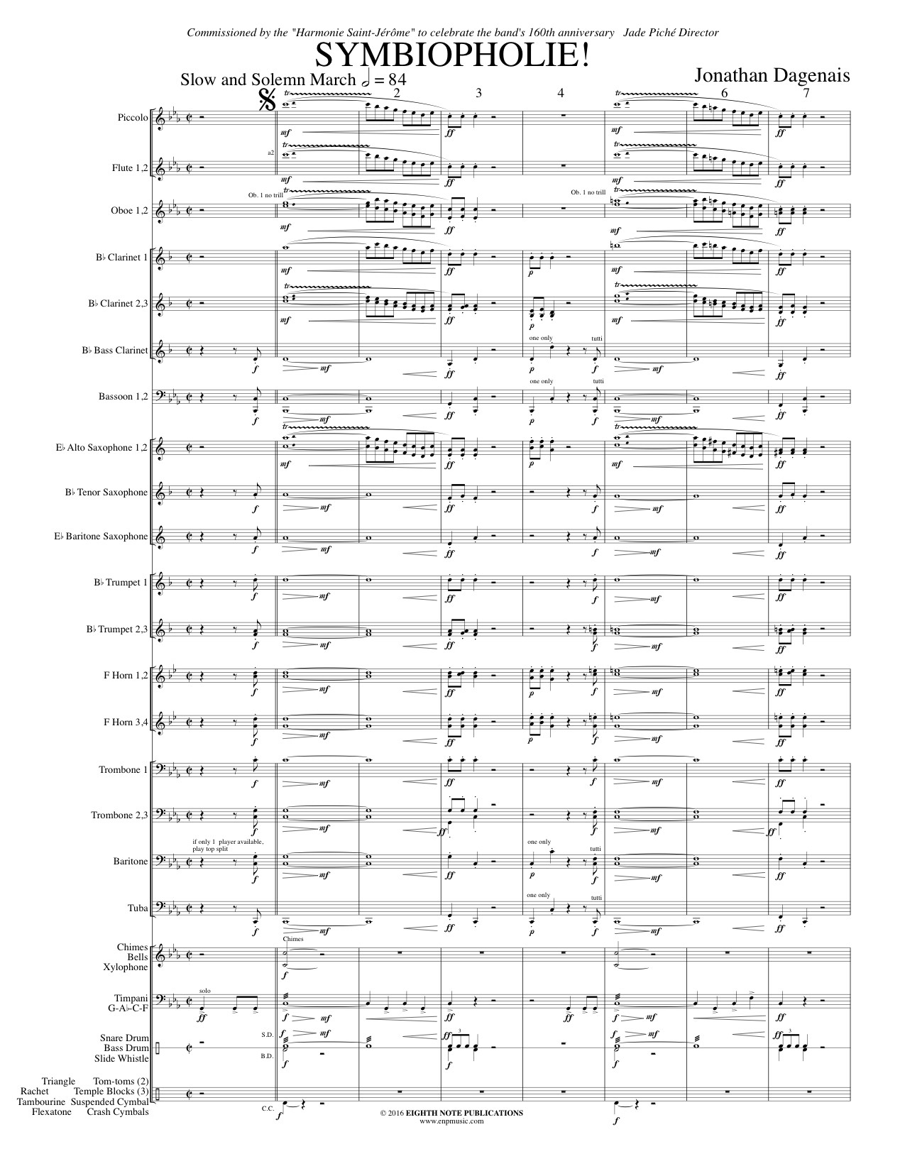 This work has two distinct sections that oppose and complete themselves at the same time. The first part is a slow march to emphasize with vigour the symbiosis of the ensemble and the second part, double time, constitutes the unbridled craziness, lively and almost uncontrollable. The entire piece mixes together in a style reminding us of the origins of the military fanfares: the march. Colorful percussion and a unique blend of styles make this exciting piece something truly different on a concert or contest. |