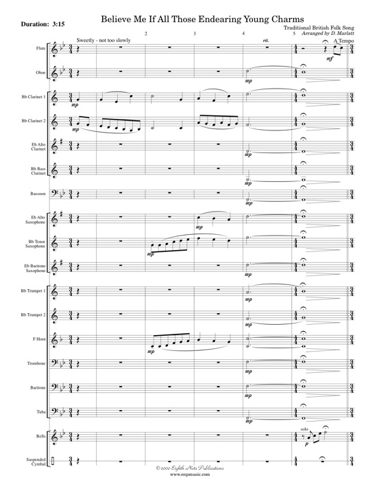 This tune is one of the favourite and most often recorded folksongs of the British Isles. The arranger has given the beautiful flowing melody to the flutes with the clarinets and alto saxophones providing interesting and almost wandering accompaniment. Melody flows from the flutes to the trumpets and even to a short duet in the clarinet section. This famous tune offers a new lyric piece for young band on your next concert. Believe Me if All Those Endearing Young Charms would also make a great warmup and tuning piece for bands of any level. |