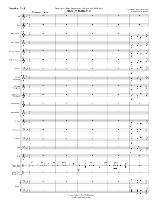 Men of Harlech is a folksong from Wales. It is a stirring and bold march that shows off every section in the band. There are percussion interjections, trumpet fanfares and large dynamic changes. This is a great band tune that develops many important ensemble playing skills. This will prove to be a popular selection with both audiences and members of the band. |
