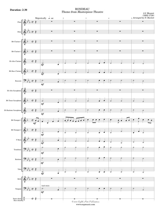 This Rondeau by Jean Joseph Mouret is recognized today as the opening theme song to Masterpiece Theatre. This famous trumpet solo features the first trumpet section in the band. Alternating sections between brass choir (plus some covering parts) and the complete band make this piece a fun one to play. Rondeau is an audience favourite and this stately piece is sure to be known by all. With typical Baroque articulations and sudden dynamic contrasts, this piece is excellent for not only featuring a section, but working on tight ensemble playing. |