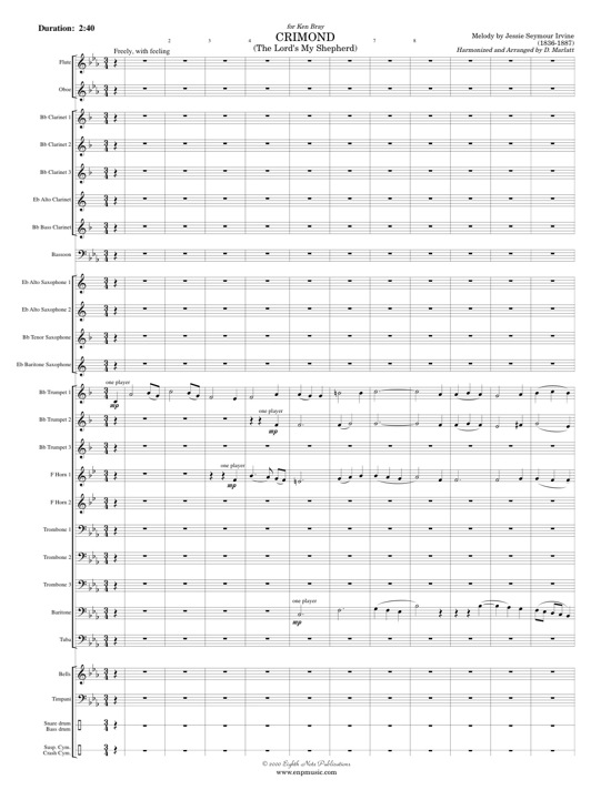 Crimond or The Lord's My Shepherd is a simple and elegant hymn that is commonly sung in church. This short arrangement opens with a solo brass quartet then builds and develops this beautiful melody into a colourful mosaic of sound and timbre. Melody is passed from section to section adding interesting rhythmic variations which leads to a large and dramatic ending, with dissonance in the lower voices, resolving to a powerful major chord. |
