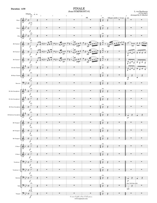 The nine Symphonies of Ludwig van Beethoven are considered by many to be among the greatest orchestrations of all time and they are often used as models by later, great composers. His Symphony No. 1 was written in 1800 and shows the powerful influences of Haydn and Mozart. The form is clear and the use of tonality is very traditional. This sort of clarity is ideal as a showpiece for band. Technical woodwind parts and supporting articulated brass passages make this orchestral transcription a great new addition for the repertoire of the concert band. |