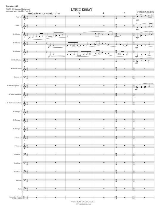 Lyric Essay is written in a neo-romantic style. It is a slow, reflective work with much opportunity for musical expression. This piece (previously published by E.C. Kirby) has been performed all throughout Canada, the United States and in Japan. It has been recorded by many organizations including several high school, university and professional ensembles. It is an ideal lyric composition to be programmed between two louder works on your next concert. |