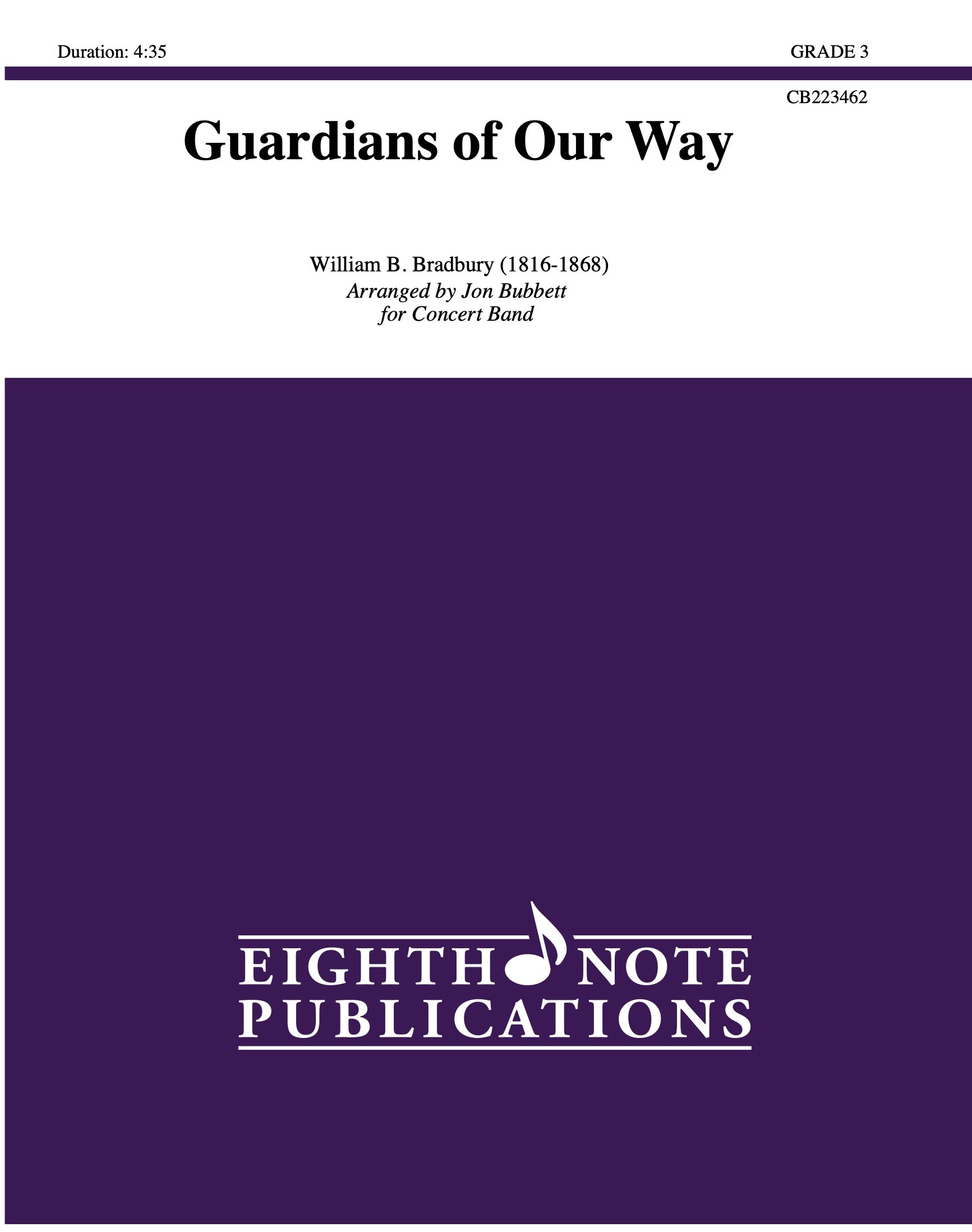 Guardians of Our Way is an arrangement of the hymn tune Bradbury and is commonly found in hymnals as Savior Like a Shepherd Lead Us. This arrangement is a reflective and poignant version for concert band.