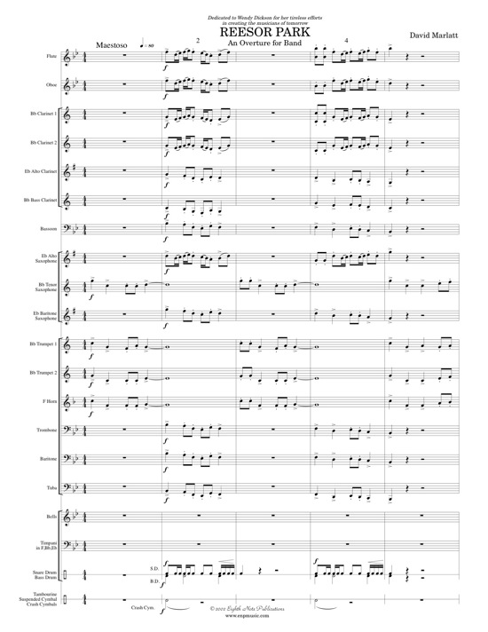 Reesor Park is an energetic overture full of rhythmic drive and interest for all players. A majestic opening quickly turns into a driving energetic section with shifting rhythms and colourful percussion. The gentle slow section brings a sense of calm with the flute melody floating over harmonies in the clarinets. The brass have a short turn with this slow melody before the return of the fast energetic material. The piece drives toward an exciting ending. Ideal for contest use! |