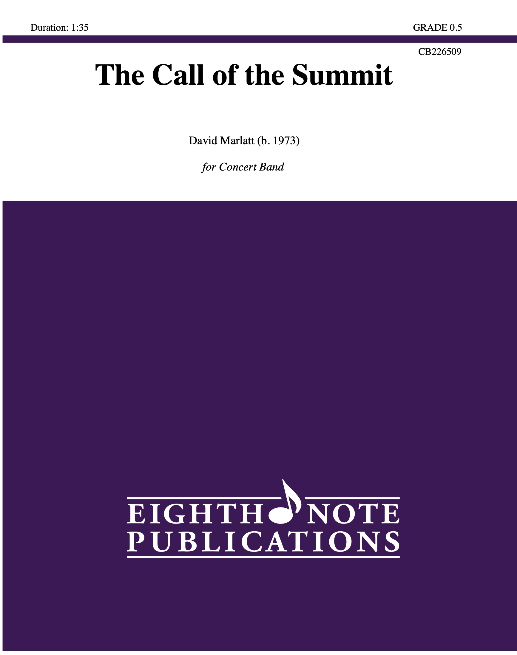 The Call of the Summit is a heroic and stately piece which uses call and response between a solo trumpet and the remainder of the ensemble to establish “the call”. With simple rhythms and limited range, this work makes an excellent first full band piece out of the method book. Besides featuring a trumpet player, the low voices get a turn with the melody as well.