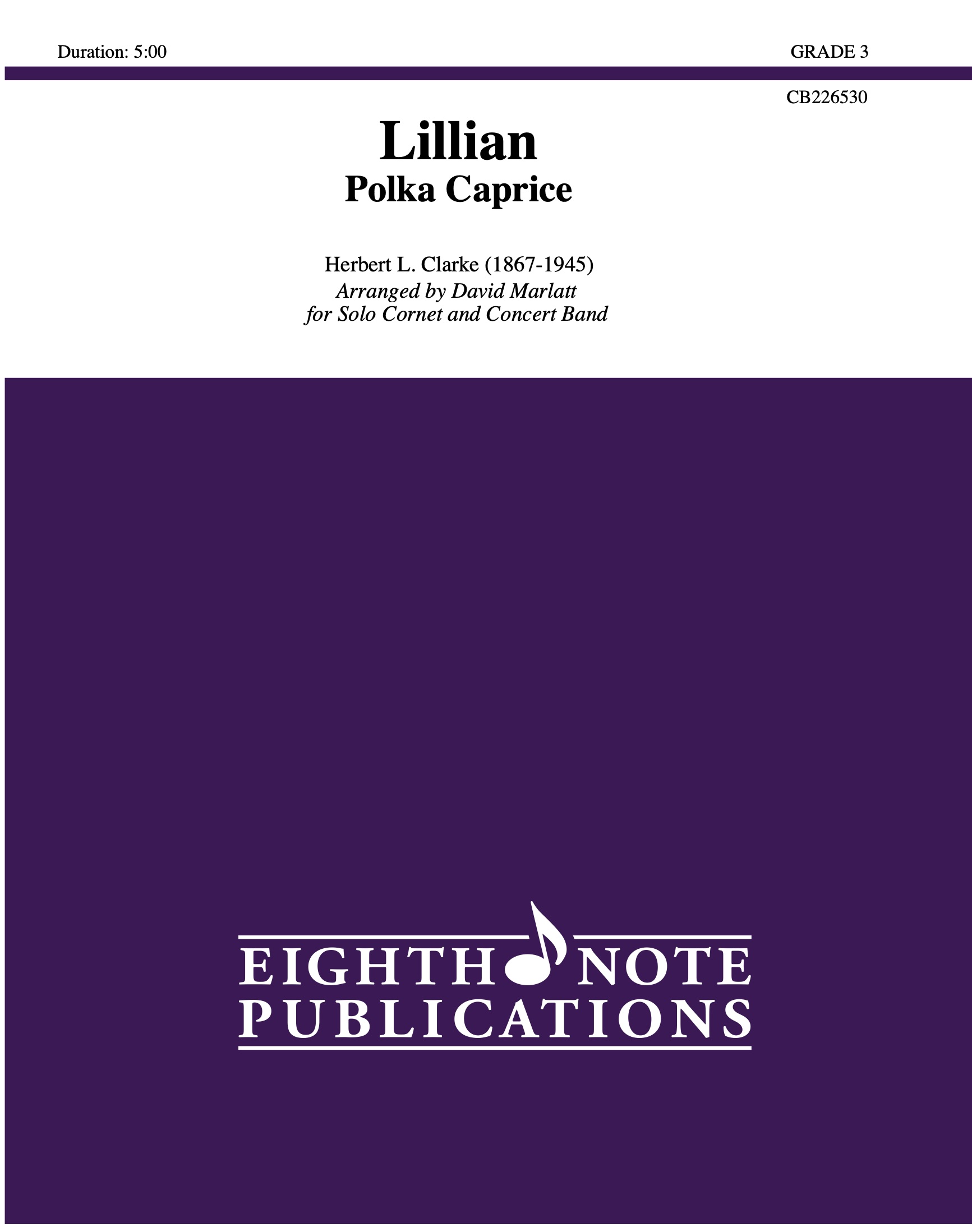 This fun light piece is a great showpiece for the cornet. It was possibly named after his second wife Lillian Bell Hause with whom Clarke had two children. There is another work by Clarke, “La Veta Caprice”, which contains much of the same material as this piece. Set as a polka, there is much opportunity for the soloist to display quick fingers and light triple tonguing. |