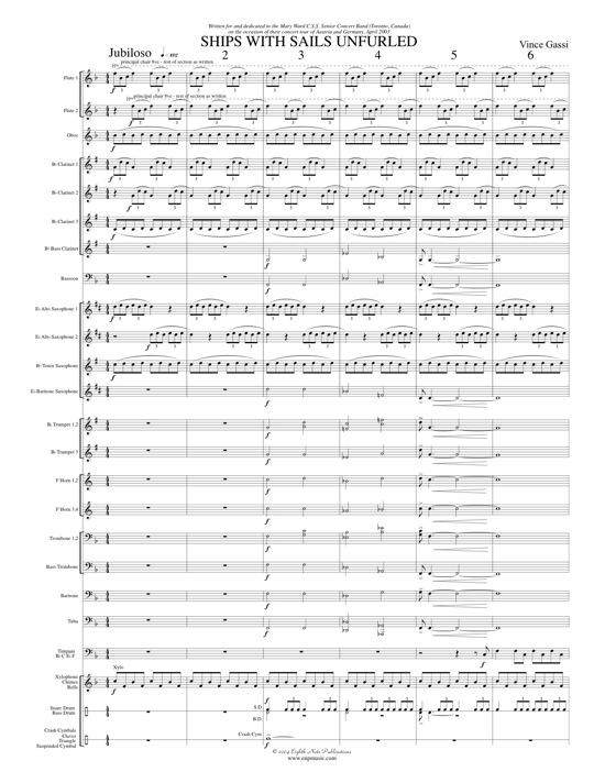 In the early morning of August 3rd 1492, Christopher Columbus went aboard the Santa Maria and gave the command to unfurl the sails. When the wind caught the sails, the three caravels were off and they had an uncharted ocean all to themselves. This is a great new programmatic work by Vince Gassi. All parts are interesting and exciting. A haunting middle section is surrounded by fast sections with driving energy from throughout the ensemble. |