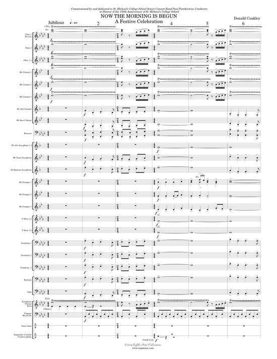 Now The Morning Is Begun was commissioned to celebrate the 150th anniversary of St. Michael's College School, a private Catholic high school for boys in Toronto, Canada. This work is constructed around two hymn tunes that have played a major role in the life of the school, Hymn To St. Michael and Michael, Prince Of All The Angels. The latter is the hymn in current use at the school, and it is from its verses that the title for this composition was drawn. |