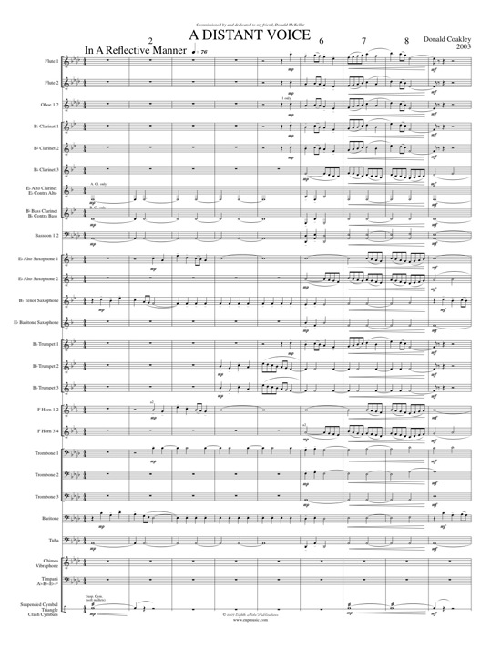 This work was commissioned by Donald McKellar, Professor emeritus of Music Education and Director of Bands at the Don Wright Faculty of Music, University of Western Ontario. He commissioned A Distant Voice following his retirement from the University. This work has no programmatic content. The work was designed as a slow, reflective and stately composition. Two contrasting melodies dominate. A Distant Voice ends as it starts, on a quiet, meditative note. |