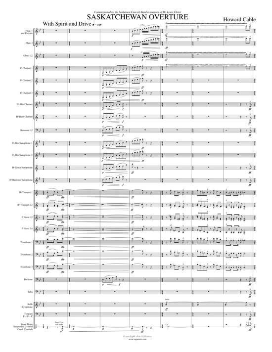 In the mid 19th Century Saskatchewan was a vast, flat, treeless and lawless area. In the 21st century it is a vibrant energetic blend of wheat, oil, potash and gas. Commissioned by The Saskatoon Concert Band, it was my goal to capture, in music, the forward thrust and the rhythmic pulse of the province today. |