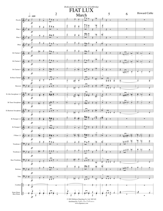 In 1951, during the war in Korea, Canadas National Defense Department produced a radio series titled Voice of the Army. The Howard Cable Concert Band was the main stay of this patriotic/public relations program. Half the musical content was military, the balance 50s pop. Thirty nine programes required two marches per show. I composed eight and at the wars end the music went to storage. Some years later I re-constructed several of these forgotten scores; one of which is Fiat Lux - Dedicated to the University of Lethbridge. |