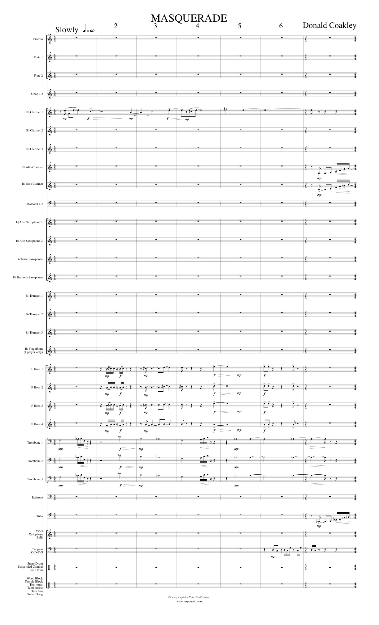 Masquerade was commissioned by the Hannaford Street Silver Band. This is a brass band whose personnel is composed top freelance musicians in Toronto, Canada. Mr. Coakley wanted to personalize the piece so he created tone rows from the letter notes drawn from the names of the members of each section of the band. These individual rows were boiled down to one row, and its derivatives. These four motives served as the thematic, and harmonic material for the composition. |