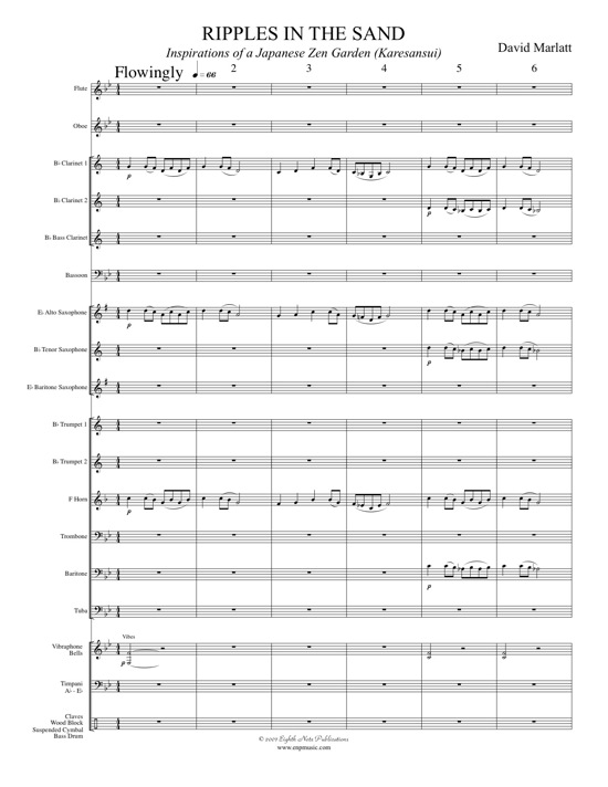 A karesansui is a Japanese rock garden which is an enclosed shallow sandbox containing sand, gravel, rocks, and occasionally grass or other natural elements. The main elements of karesansui are rocks and sand, with the sea symbolized not by water but by sand raked in patterns that suggest rippling water. The most famous Zen garden is at the Ryoan-ji Temple in Kyoto, Japan. This short work is peaceful and reflective and accessible to young musicians. The major pentatonic scale is used as the basis for this composition which creates an interesting texture and evokes the sound of an ancient Japanese folk song.