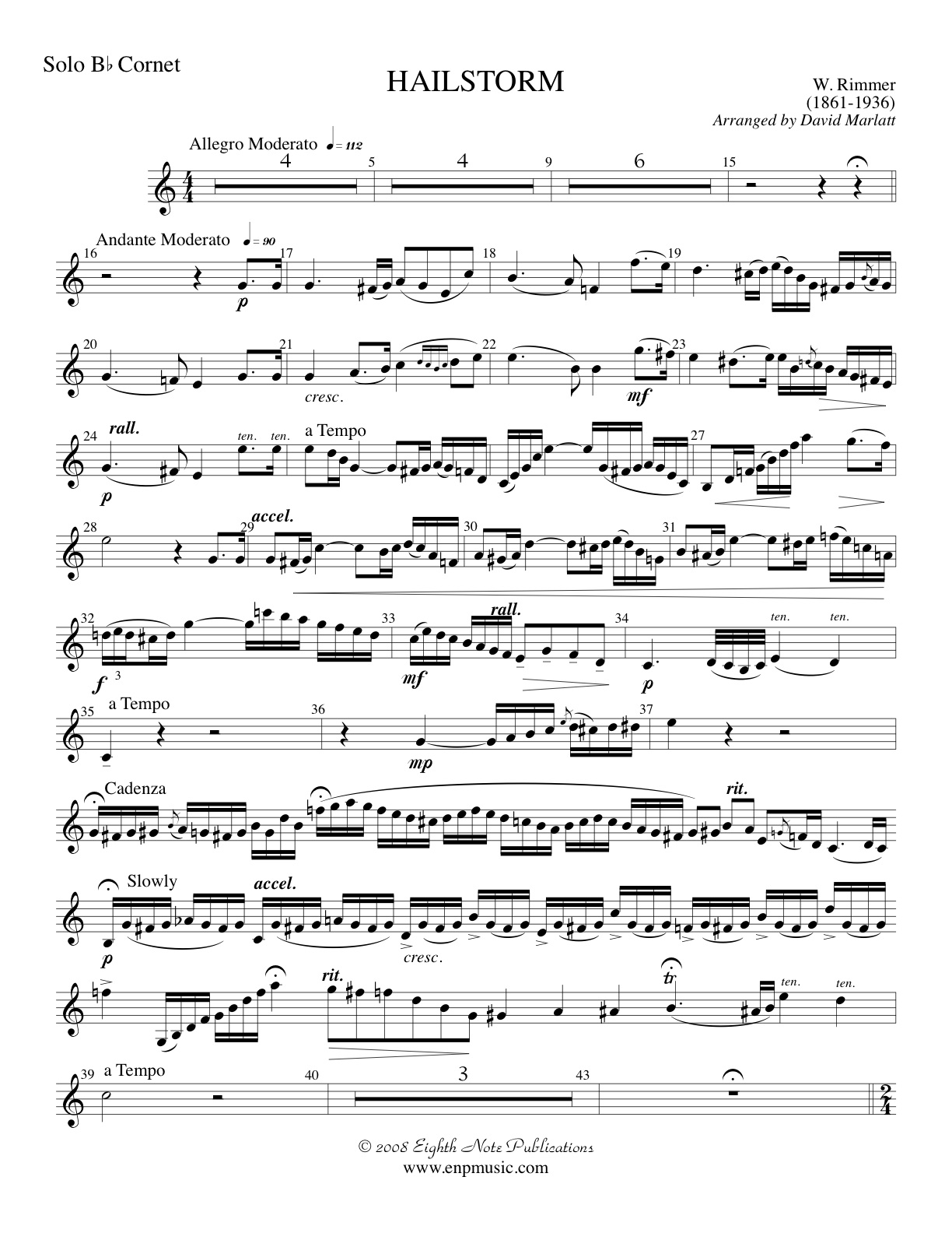 This is a standard cornet solo in the brass band world. It has been played thousands of times by amateur and professional players. It has been arranged for concert band to allow for a new setting of this great technical solo. After a brief introduction by the band, the soloist enters, playing a lyrical melody which is followed by a short cadenza. Then the triple tonguing starts! This is a great showpiece for the cornet that is sure to dazzle audiences. |