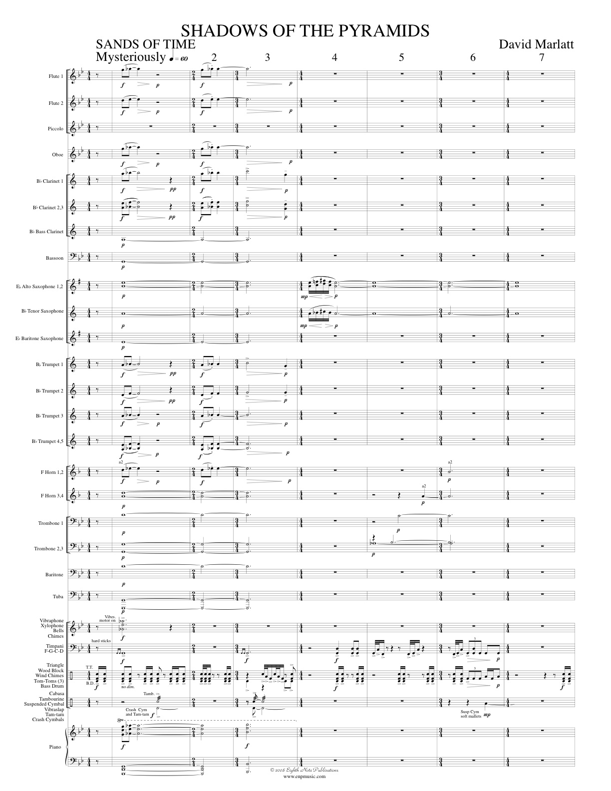 This powerful piece is based on the Egyptian story of Ra, the Sun God, one of the most important characters in their mythology. It is divided into four main sections, each with its own contribution to the story. Great Hollywood sounding brass parts, an optional part and energetic percussion writing are found throughout this dynamic piece. |