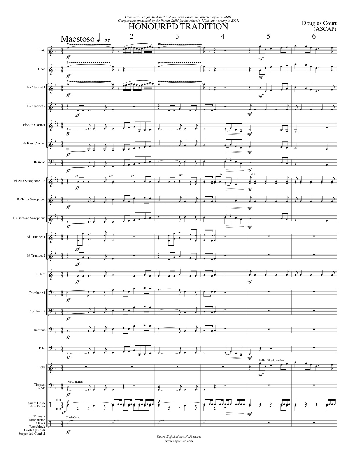This overture by talented composer Doug Court was commissioned by the Albert College Wind Ensemble, Scott Mills directing. Rich harmonies and driving rhythms propel this piece through several sections: Majesty of the past, Young life, Reflections of the past and A look to the future.
