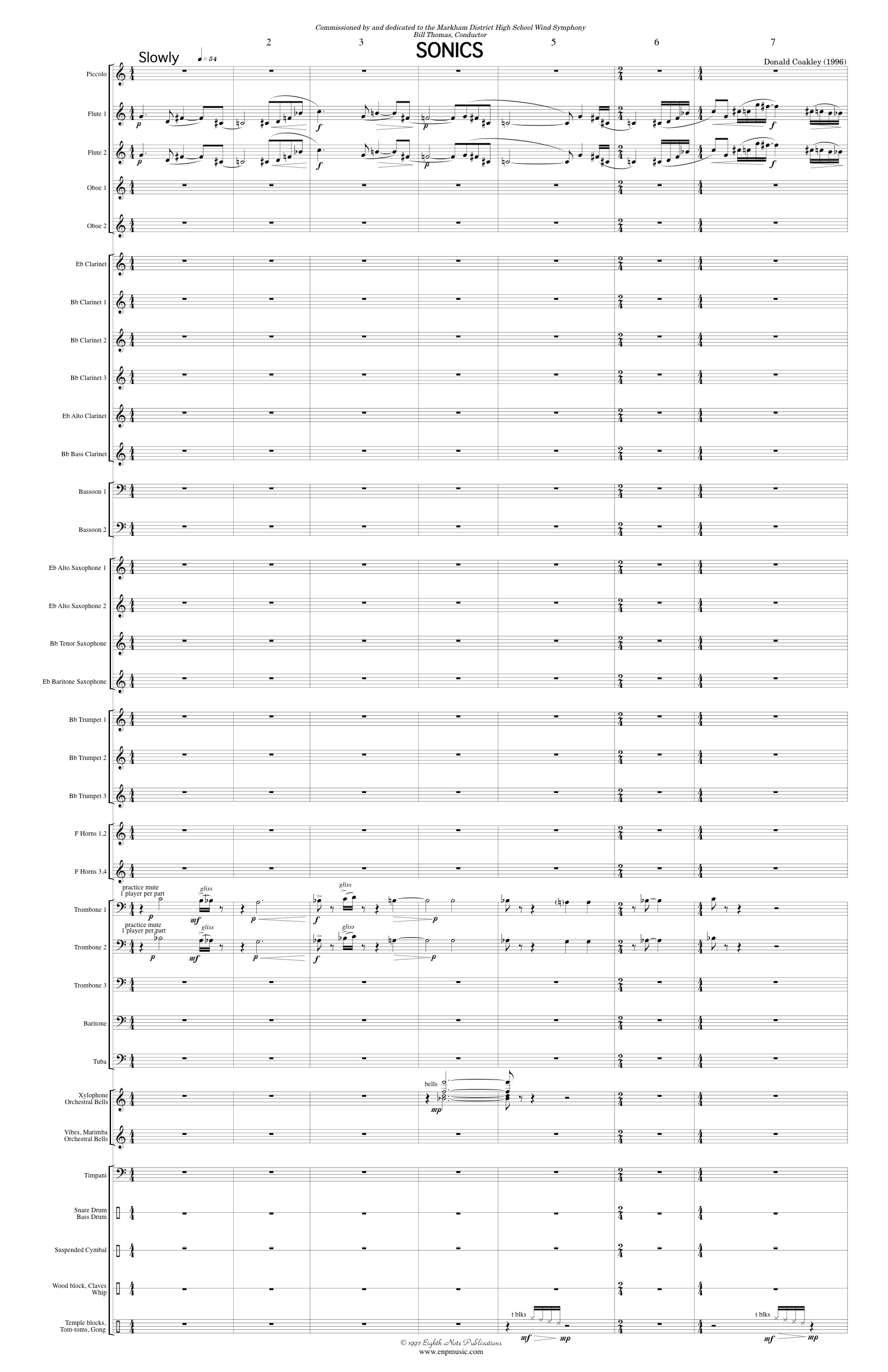 This spectacular piece, commissioned by the Markham District High School Wind Symphony, Bill Thomas conductor, is a large-scale dramatic work for concert band. Chromatic harmonies and dissonant intervals create tension and excitement. Mr. Coakley's brilliant writing for the many band pieces he has done has reached a pinnacle with this new composition. Sonics is around 12 minutes in length and touches on a variety of compositional techniques. Within the sonata-allegro form themes are introduced and developed throughout the ensemble. Contrapuntal elements as well as many meter changes (7/8, 5/8) keeps the pace of the piece quick and energetic. This is a monumental addition to concert band literature and will quickly find it's place with other Grade 6 level band pieces. The composer describes this work as "acidy" and that term seems to best capture the mood of the piece. Sonics is a very difficult work that would prove to be a challenge for a university/college level ensemble. Professional bands may also consider this piece because of the virtuosity that is required from all players. |
